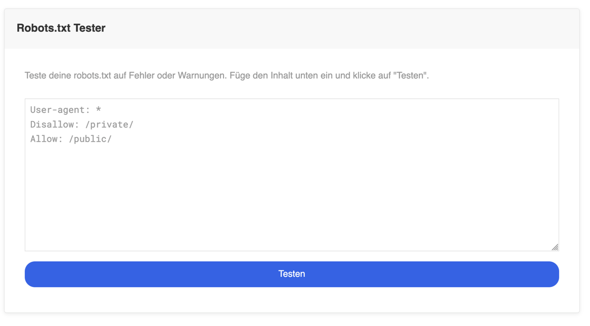 Mit unserem robots.txt Testing Tool kannst du mit nur einem Klick prüfen, ob deine robots.txt-Datei korrekt konfiguriert ist. Eine fehlerhafte robots.txt kann dazu führen, dass Suchmaschinen wie Google wichtige Seiten deiner Webseite nicht crawlen oder falsch interpretieren. Füge einfach deine robots.txt in das Tool ein – wir analysieren sie auf Syntaxfehler, ungültige Pfade oder widersprüchliche Regeln. So stellst du sicher, dass deine Webseite optimal für Suchmaschinen zugänglich ist und keine wichtigen Inhalte versehentlich blockiert werden. Keine Technik-Kenntnisse nötig – wir zeigen dir genau, was zu tun ist!