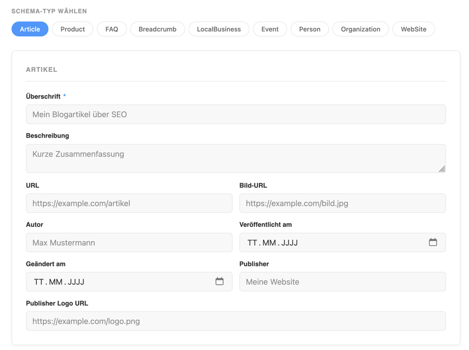 Einfach strukturierte Daten für deine Webseite erstellen - Mit unserem JSON-LD Schema Builder kannst du einfach und schnell strukturierte Daten für deine Webseite erstellen – ganz ohne Programmierkenntnisse. Strukturierte Daten helfen Suchmaschinen wie Google, den Inhalt deiner Seite besser zu verstehen und in den Suchergebnissen als Rich Snippets anzuzeigen. Wähle einfach den passenden Schema-Typ (z. B. Artikel, Produkt, FAQ, Veranstaltung), fülle die Felder aus und kopiere den generierten Code in den <head>-Bereich deiner Webseite.